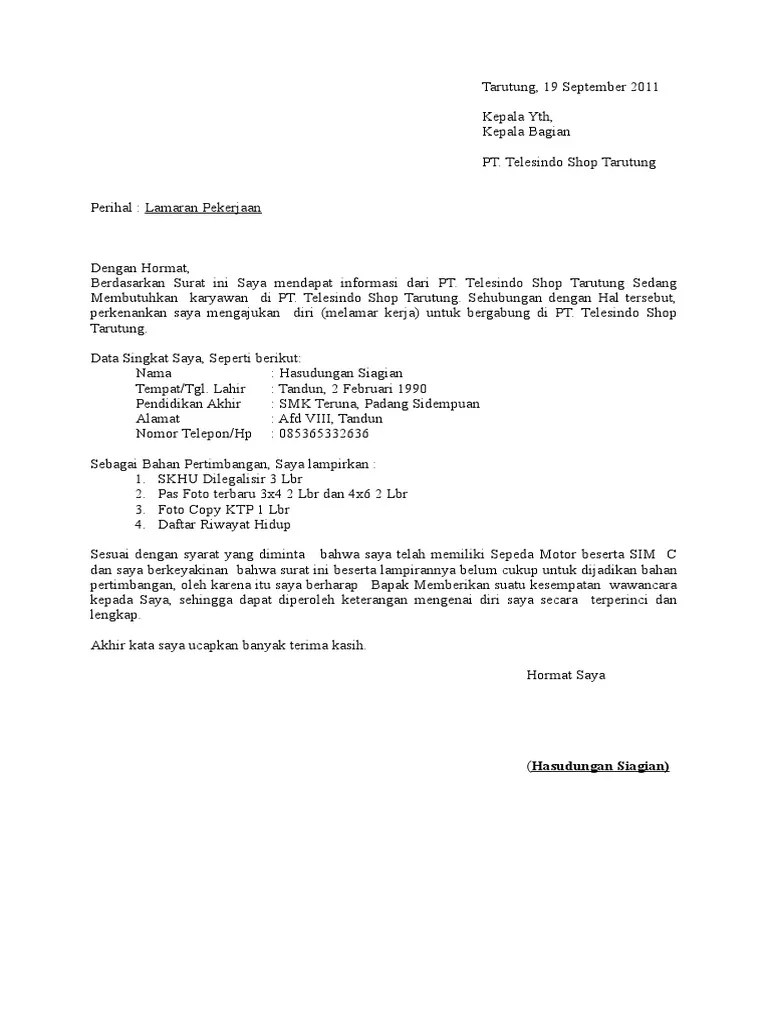 Demikian surat lamaran kerja ini saya buat dengan manaruh besar harapan untuk mendapat kesempatan wawancara langsung, dan dapat diterima untuk menerapkan . Ciri ciri surat lamaran pekerjaan untuk melamar kerja pada . Sehingga contoh surat permohonan kerja yang anda ajukan ke hr perusahaan dapat diterima dengan baik. Cara menulis surat lamaran kerja · 1. Dulu, surat lamaran kerja memang selalu dikirimkan lewat pos atau diantar langsung ke perusahaan/kantor. Menulis surat lamaran kerja menjadi salah satu bagian penting dari sejumlah rangkaian yang haus dilakukan saat sobat medcom melamar . Nama orang beserta gelar dan jabatannya atau perusahaan . Surat lamaran kerja adalah surat yang digunakan untuk melakukan permohonan mendapatkan pekerjaan sesuai pengalaman pada perusahaan tertentu. Foto ukuran 3 x 4; Tempat dan tanggal penulisan surat. Saat ini tengah mencari pekerjaan. Mulai untuk magang sampai melamar formasi cpns yang dilirik hrd. Contoh surat lamaran kerja umum, simple, tulis tangan, dan terbaru yang baik dan benar terlengkap ini saya buat kepada para pencari kerja .